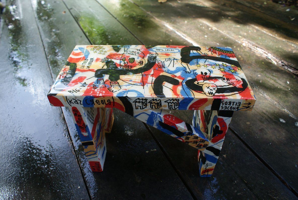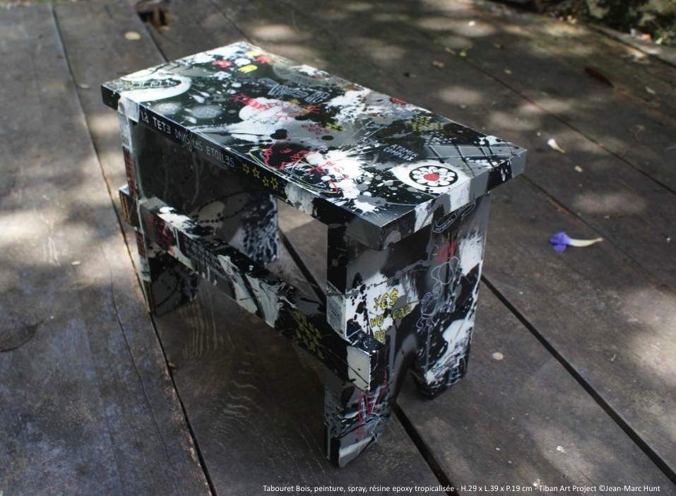 « Traditionnellement aux Antilles, le Tiban est un petit tabouret en bois à usage d’appoint en intérieur comme en extérieur. Sa forme est étroitement liée à l’architecture des cases créoles. J’ai voulu redéfinir, réinventer son rôle en tant que spécimen unique porteur de sens et d’histoire. Fidèle à une ligne technique de fabrication artisanale, je privilégie l’œil, le regard sur sa fonction première. Un travail critique et ironique remettant en question les relations entre patrimoine, artisanat, design et œuvre d’art. Tiban Project transcende la culture antillaise et entreprend un geste séminal d’anti design »