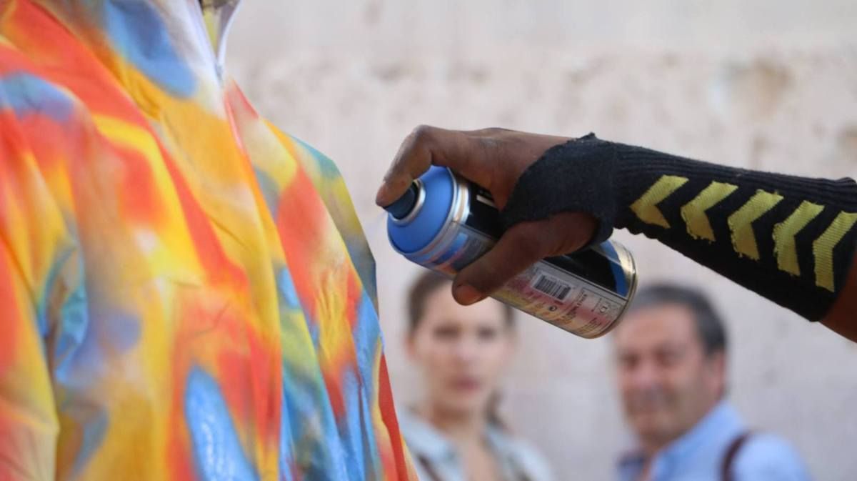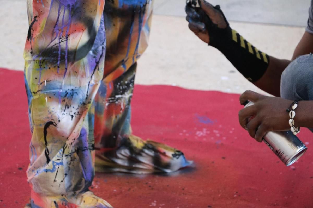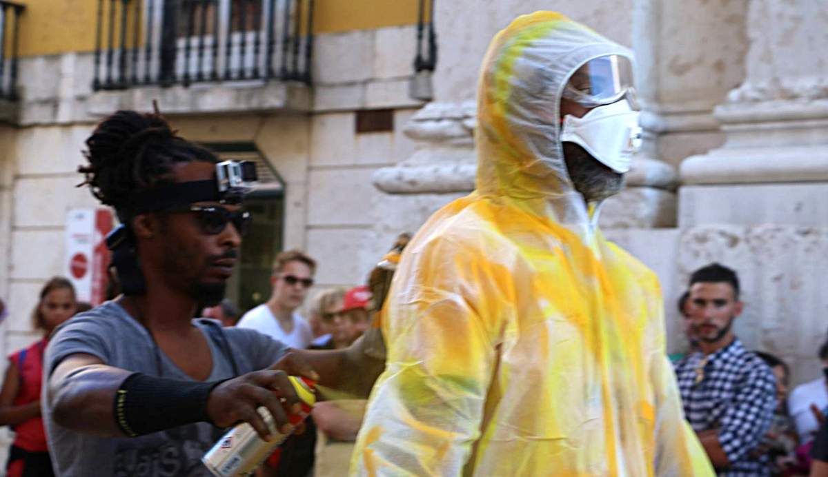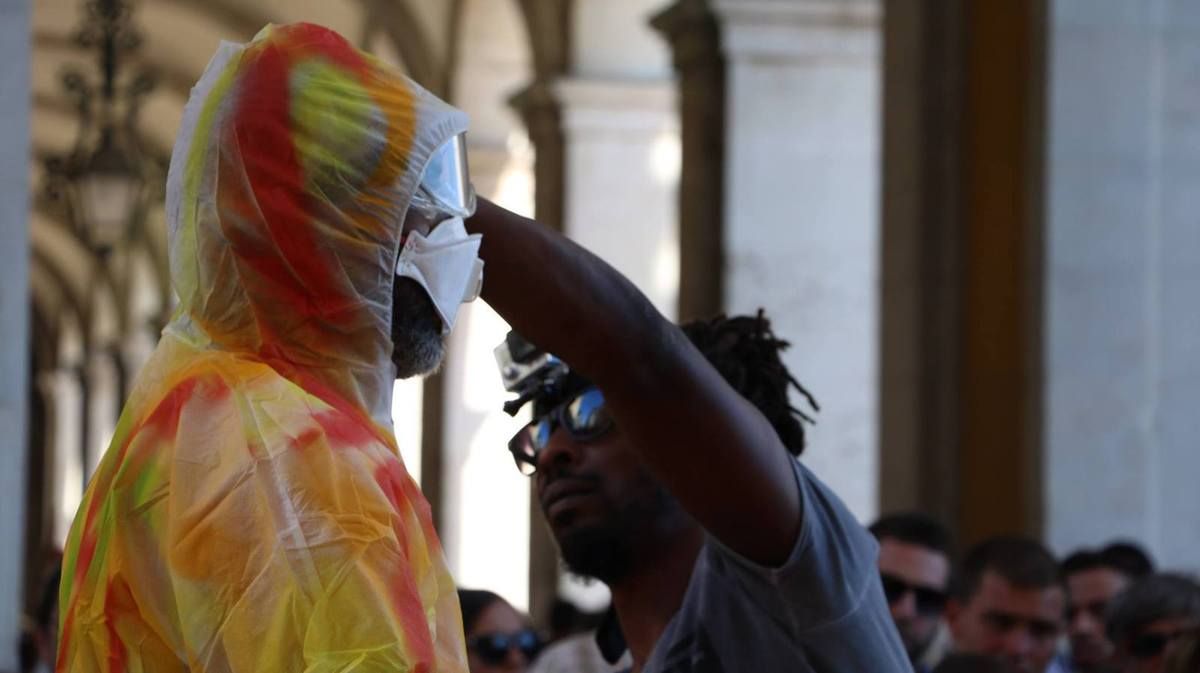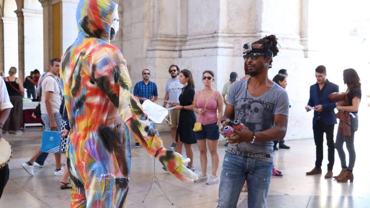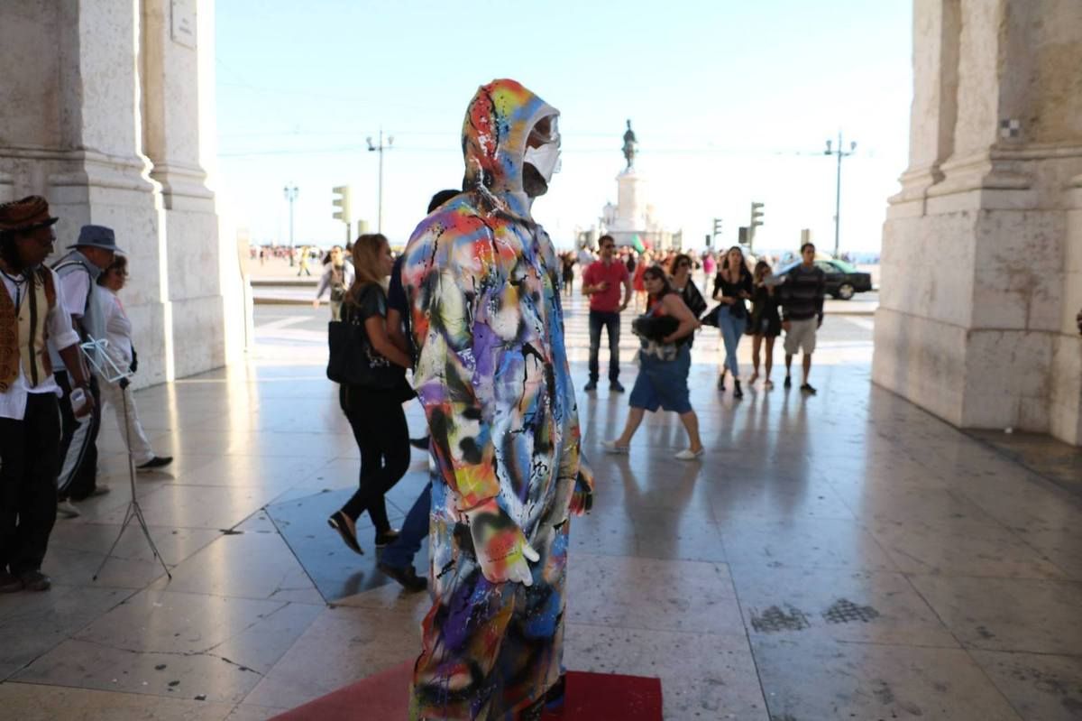 Invité par Krystell Ann Art Gallery, Jean-Marc Hunt réalise la performance Ka painting 45' avec le musicien Djo Toussaint et la collaboration de Olivier Tharsis, sur la place du Commerce à Lisbonne (Portugal). Crédit photo ©Krystell Ann Art Gallery octobre 2016.